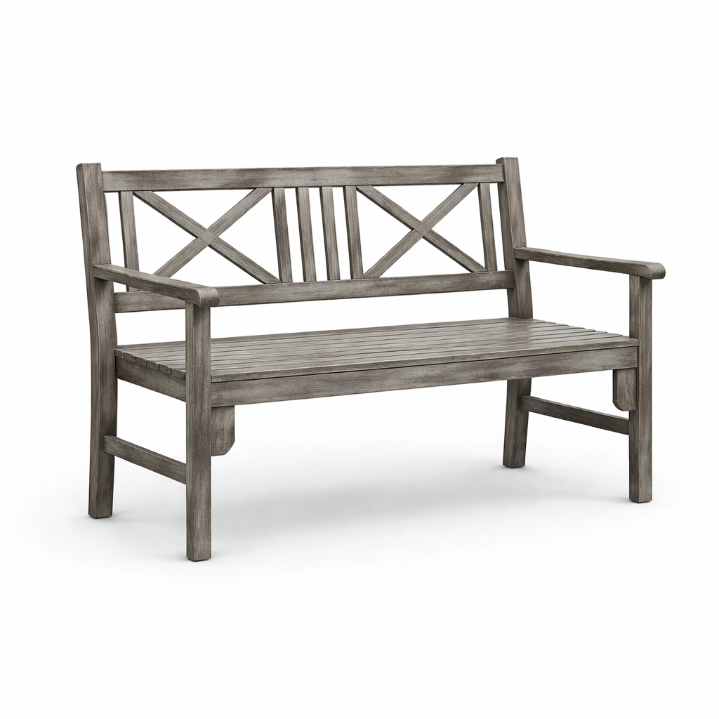 Die Gartenbank besteht aus Teakholz mit wetterfester Oberfläche.