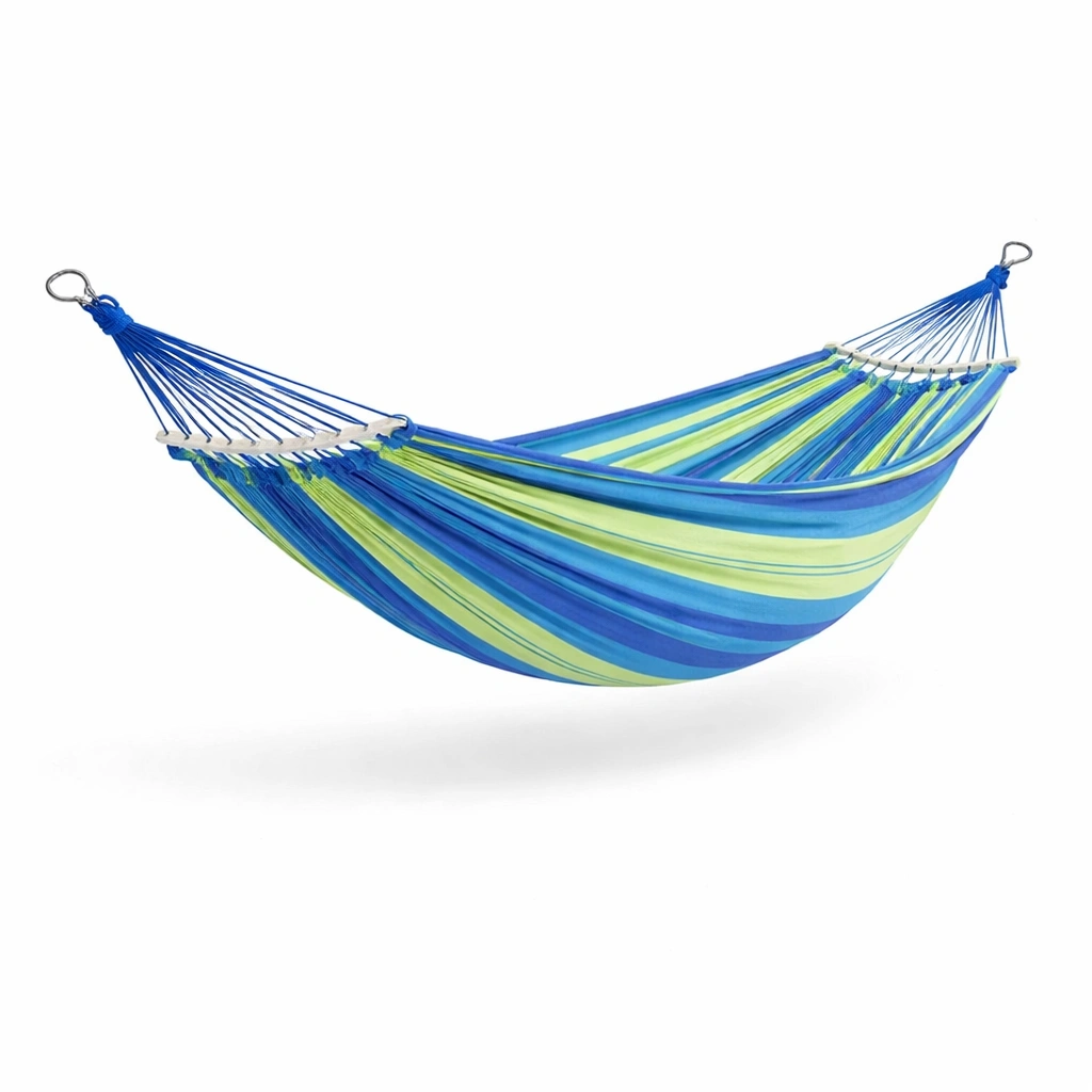 Material: 100% Baumwolle. Die Hängematte ist in den Farben Blau und Grün gestreift und misst 200 cm in der Länge und 150 cm in der Breite. Sie hat eine Tragkraft von bis zu 150 kg. Zur Befestigung sind Edelstahlringe enthalten.