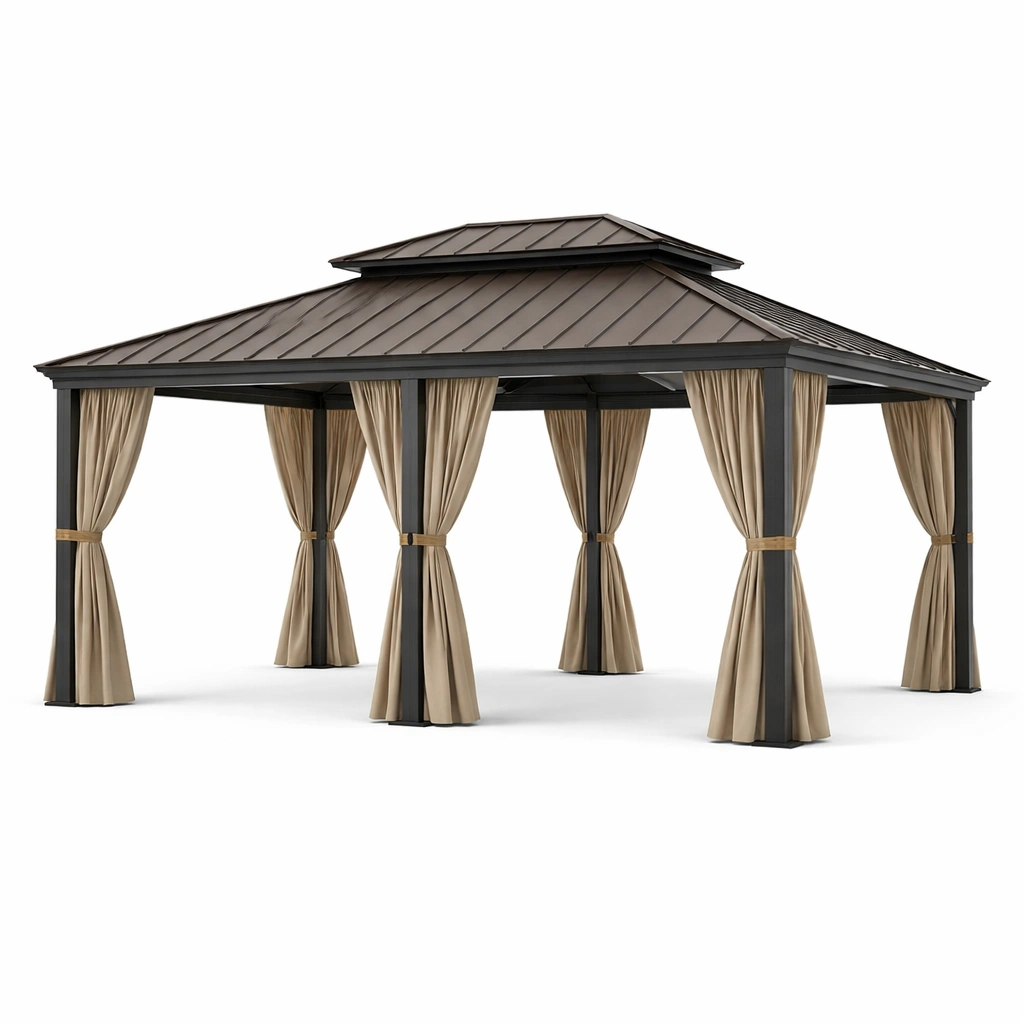 Der Pavillon besteht aus einem Aluminiumrahmen und einem Stahldach. Die Vorhänge sind aus Polyester gefertigt.