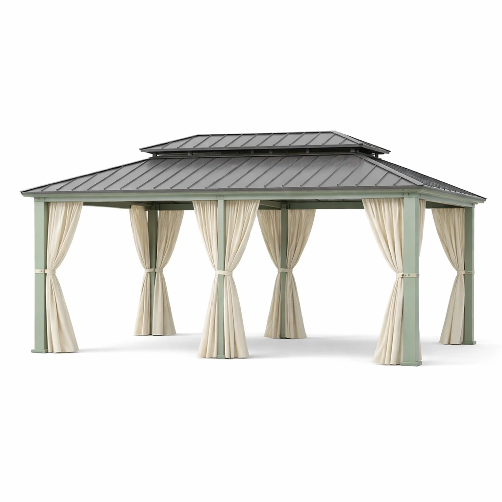 Das doppellagige Dachdesign sorgt für optimale Belüftung. Der beige Pavillon ist für den Außenbereich geeignet.