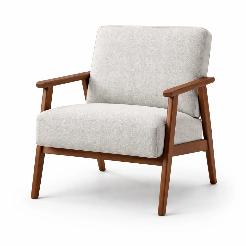 Der Sessel besteht aus einem Bezug aus Polyestergewebe und einem stabilen Rahmen aus Massivholz.