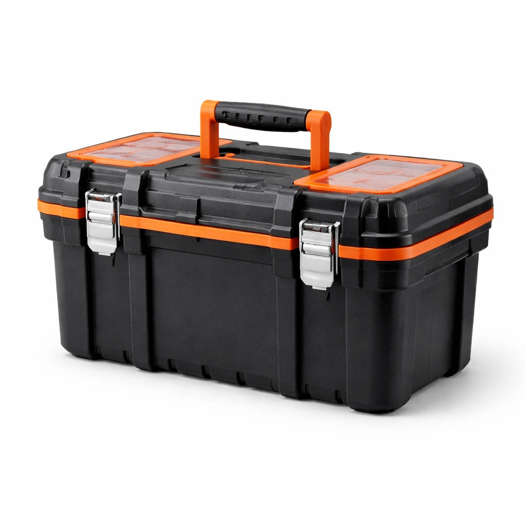 Der ergonomische Griff erleichtert das Tragen, und das Gehäuse mit verstärkten Ecken sorgt für zusätzliche Stabilität. Der Deckel hat einen integrierten Organizer, und ein herausnehmbares Innenfach bietet zusätzlichen Stauraum.